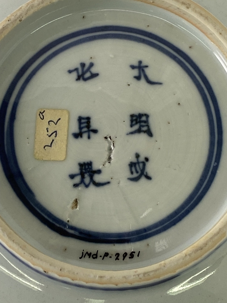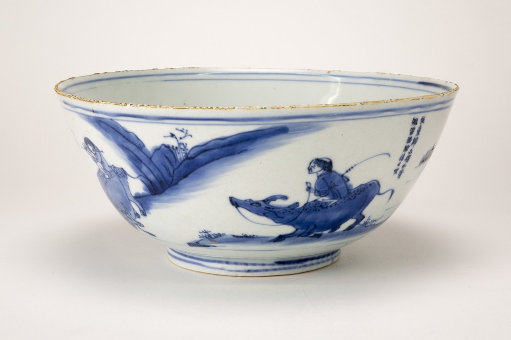 kastkom met rondlopend blauw landschapdécor en chinese teksten. Ch'en Hua
