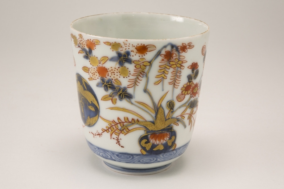 Beker Meer informatie Collectie Jan Menze van Diepen Stichting Beschrijving Witte Imari beker zonder oor met op de buitenzijde twee maal een vaas met bloemen en twee maal een blauwe cirkel met goudkleurige bloemen. In de kleuren blauw, ijzerrood en goud. Details Materiaal/techniek gebakken keramiek Inventarisnummer JMD-P-1122 Objectsoort beker Deel dit voorwerp Deel dit object op Facebook Deel dit object op Twitter Deel dit object op Instagram Deel dit object op Pinterest Deel dit object op WhatsApp