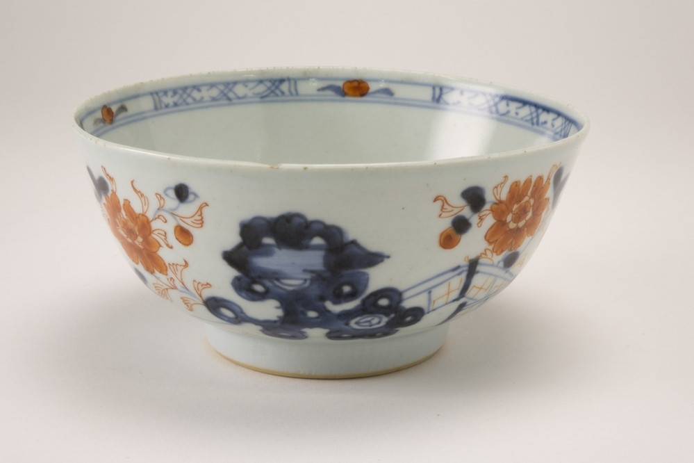 Imari kom op standring. Aan de binnenzijde langs de rand een blauwe band met vier ijzerrode bloempjes. Op de bodem een bloempje. De buitenzijde gedecoreerd met een hekwerk, een tuinrots en diverse bloemen in blauw, ijzerrood en goud.