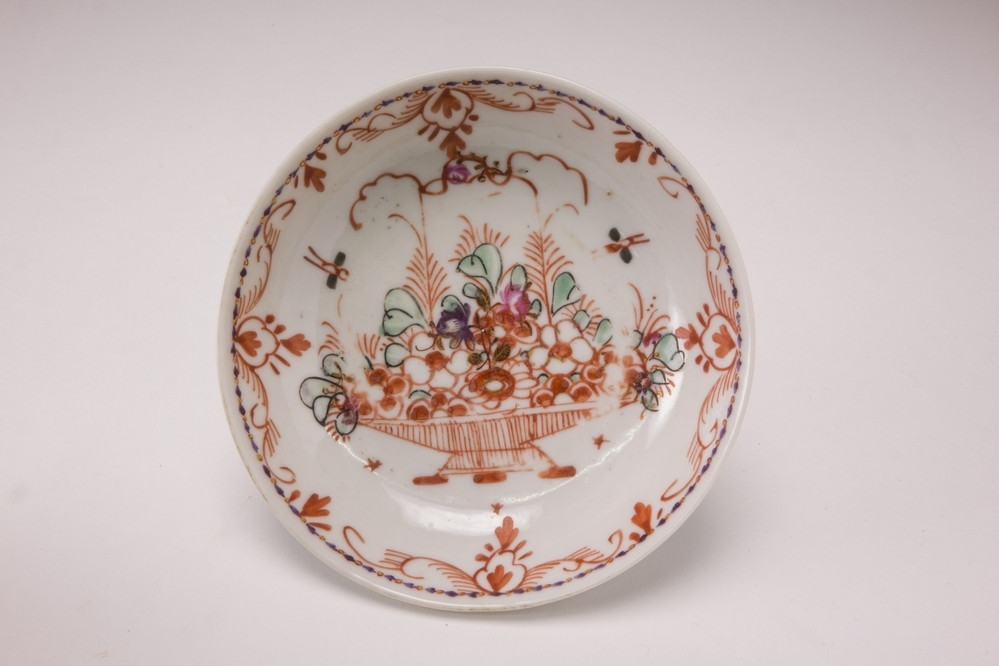 Schotel, Chinees porselein, met in Holland aangebrachte beschildering, Amsterdams bont, in rood, blauw, groen en goud, 18de eeuw. Plat: een een rijkversierde hengselmand en bloemversieringen. Rand: een guirlande versiering in ijzerrood en zwart.