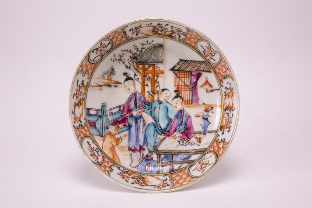 Schoteltje met op het plat veelkleurige Mandarijn- landschapdecors met o.a. drie volwassenen en een kind. De versiering is kenmerkend voor de groep die in Nederland ‘mandarijn’ genoemd wordt, verwijzend naar de naam die in het Westen aan alle Chinese ambtenaren gegeven werd. Daarbij wordt vaak paars, oranje, geel, een hard roze en bruin email toegepast, terwijl als onderwerpen meestal Chinese figuren en familietaferelen geschilderd zijn. In Groningen heet de variant met goud (zoals hier) ‘herenmandarijn’, de variant zonder goud ‘boerenmandarijn’.