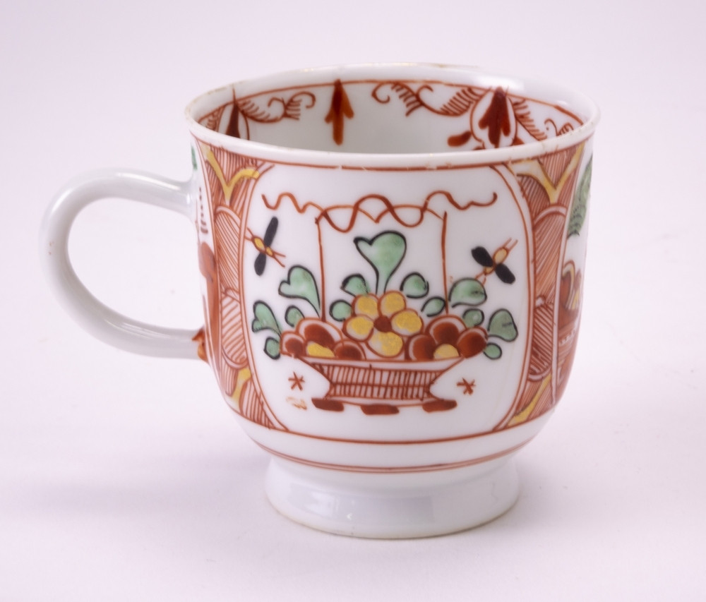 Amsterdams bont kopje met oor op standring. Op de buitenzijde witte uitsparingen met hierin een hengselmand of een landschapje. Aan de binnenzijde gedecoreerd met guirlandes. Breuk is aan binnenzijde orgineel overschilderd.