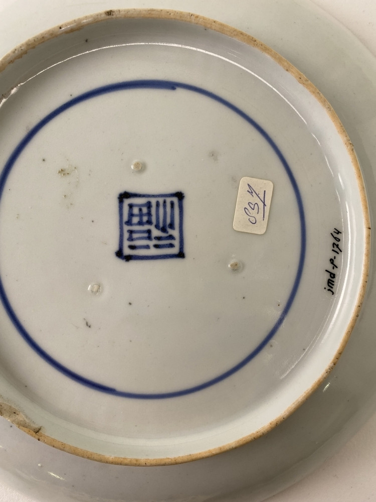 Dish on footring, spreading sides with modelled kidney-shaped medallions and cloud motifs in low relief, lightly scalloped brown rim. On the base three spur-marks. The reverse with vertical scatter marks. Decorated in underglaze blue with two figures under a pine tree, the one at left holding a parasol. The sides are undecorated. On the base a square fuku (good luck) mark. Besides manufacture for export in the third quarter of the 17th century, blue-and-white porcelain was also produced for the domestic market. It is a continuation and further development of shoki-Imari of the first half of the 17th century, but of better quality. It is characterised by the use of typically Japanese stylised and isolated motifs and the sides of plates and dishes are sometimes modelled in low relief but left undecorated. Such porcelain was by no means intended exclusively for export. Nonetheless, it came to Europe as souvenirs or as part of an order. The presence of a few pieces in early documented collections (e.g., Burghley and Dresden) appears to confirm this. Comparable pieces with a similar mark are in the Shibata Collection (Arita 1990, 1991). There are two identical examples in the Van Di...