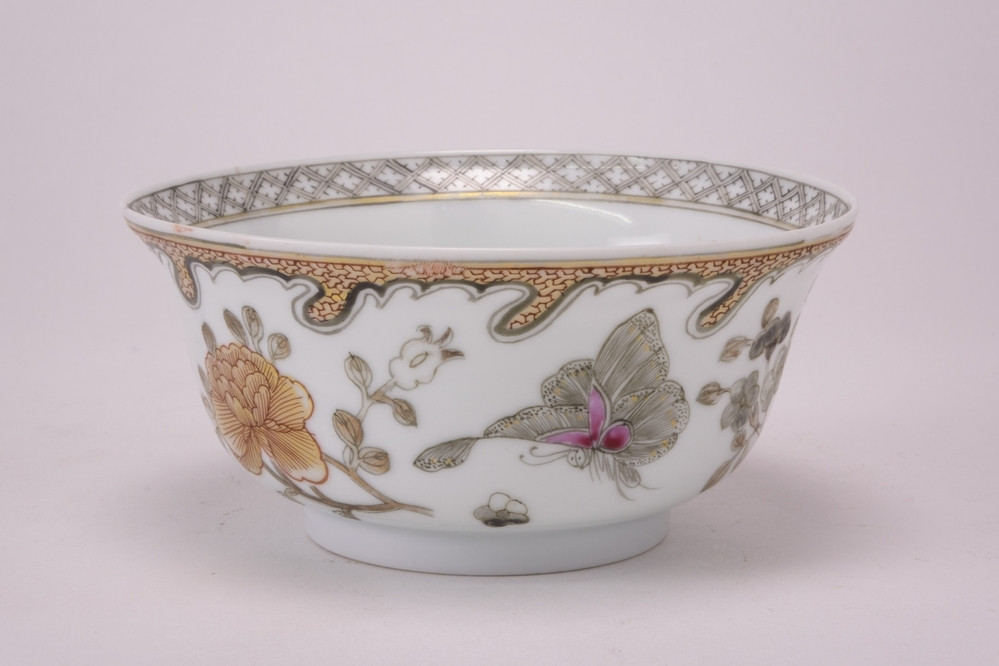 Encre de Chine 1725-1775 Object 2011819 Bowl China c.1730 Height 56 mm (2.20 inch), diameter of rim 118 mm (4.65 inch), diameter of footring 55 mm (2.17 inch), weight 107 grams (3.77 ounce (oz.)) Bowl on footring, spreading sides and upturned rim. Decorated in various enamels, encre de Chine with two flower sprays and beetles and butterflies. Around the rim a diaper-pattern border. On the bottom an orchid (Cymbidium virescens) only visible in ghost form. On this bowl the Chinese porcelain painter's interest in insects, evident from the Wanli period onwards, is combined with encre de Chine which allowed finely and detailed painting. The encre de Chine decorating style was used not only for reproducing European prints, but also for decorations in the Chinese style as applied here on this bowl. (Jörg & Van Campen 1997, p. 169, cat. 186 & p.221, cat. 251) The orchid (Cymbidium virescens), the Lan Hua. is a motif commonly seen on fine Chinese export porcelain of around 1740. Condition: Wear to the blue enamel. a very tiny glaze hairline (3 mm (0.12 inch) to the rim only visible on the inside and a hairline to the base. Reference: Jörg & Van Campen 1997, cat. 186 &...