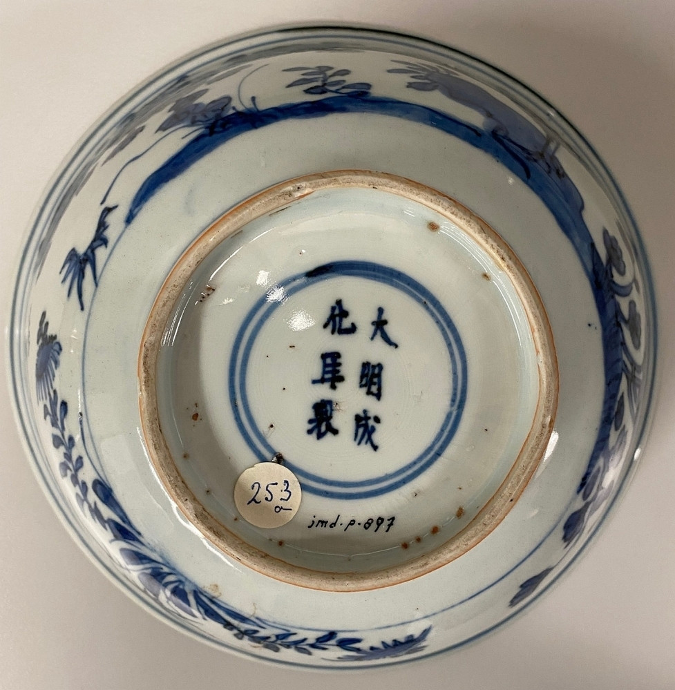 Bowl on footring, spreading sides, bulging upright edge. Decorated in underglaze blue with a continuous landscape with l...tire surface and, unlike kraak porcelain ‘klapmutsen’ and crow cups, is not restricted to panels or medallions.||JMD-P-0897