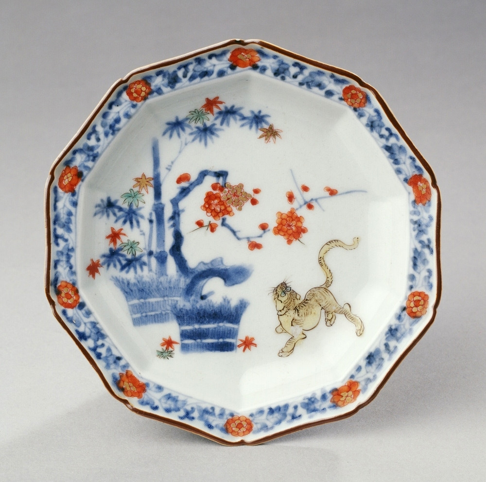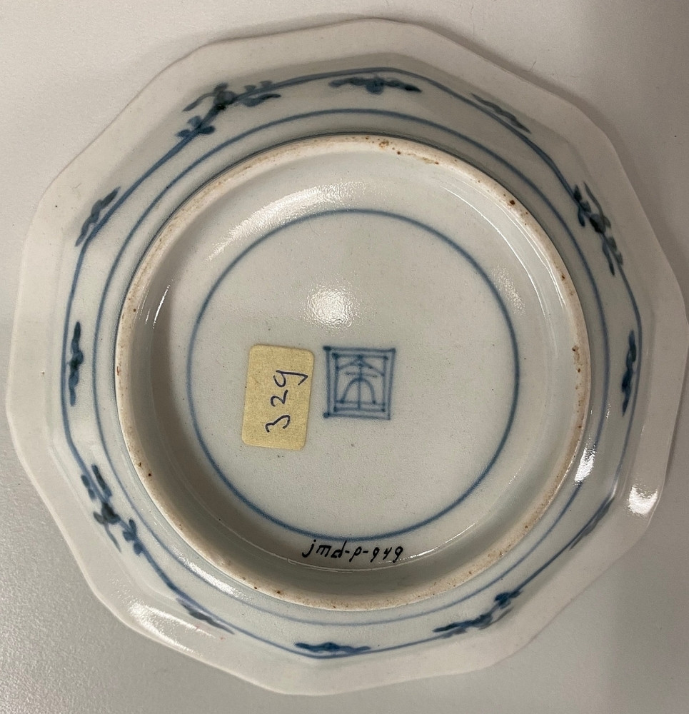 Ten-sided small dish on round footring, spreading sides, flat rim, upturned brown edge with indented corners. Decorated ...phant cannot follow), it also signifies safety. An identical dish is in the Groninger Museum, Groningen (Arts).||JMD-P-0949