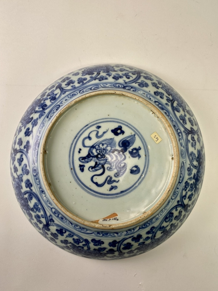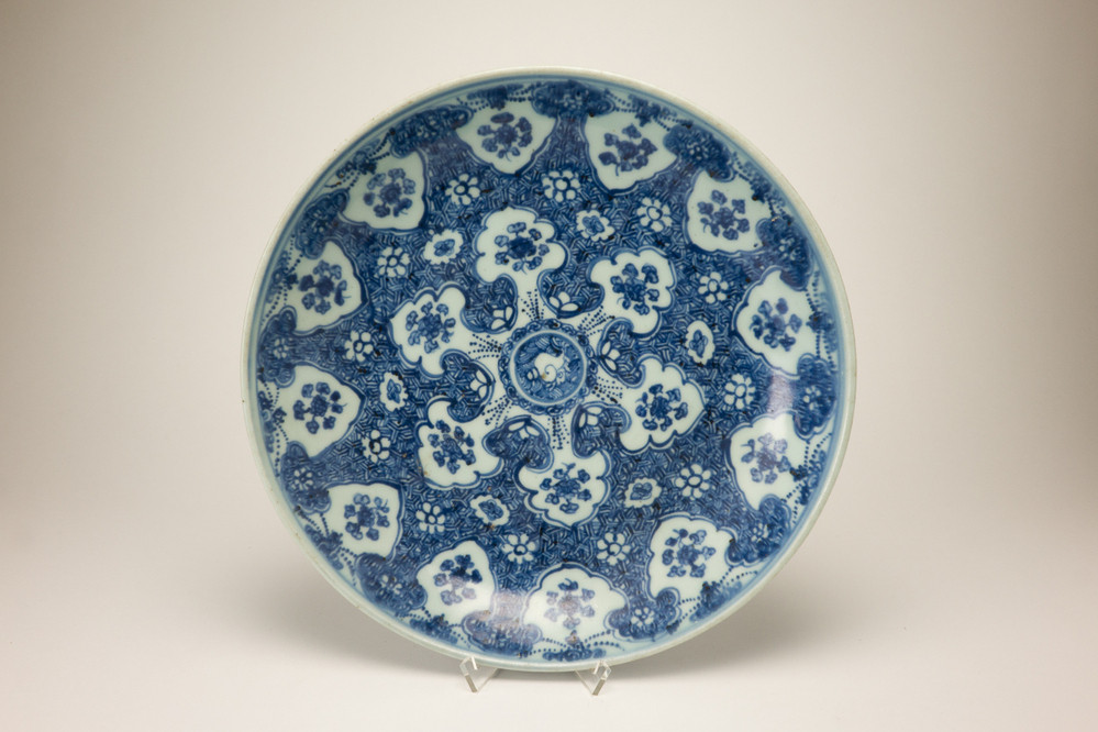 Dish on footring, spreading sides. Decorated in underglaze blue with the decoration in white reserved on a blue ground w...pe have a representation on the base and are characterised by an abundant, complex decoration (Krahl & Ayers).||JMD-P-1166a