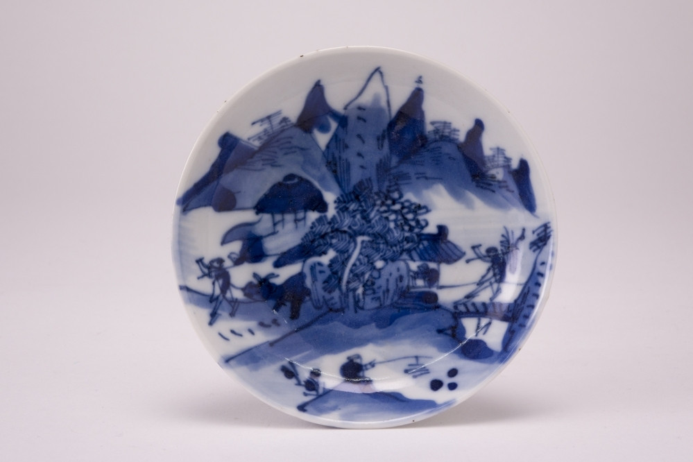 Saucer-dish with (mythological) animals, landscape and flower sprays