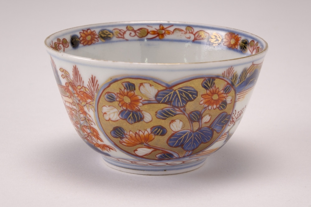 Straight-sided cup and saucer with petal-shaped panels with flower sprays