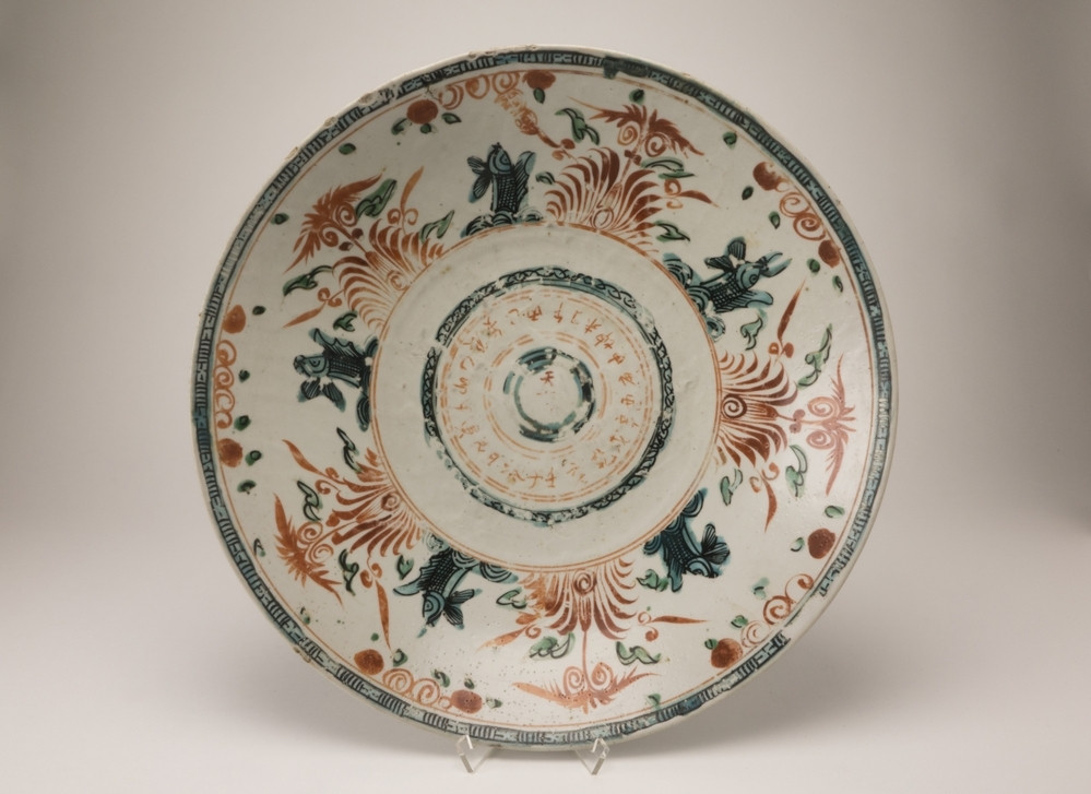 Octagonal cup and saucer with light brown, animals and flower sprays