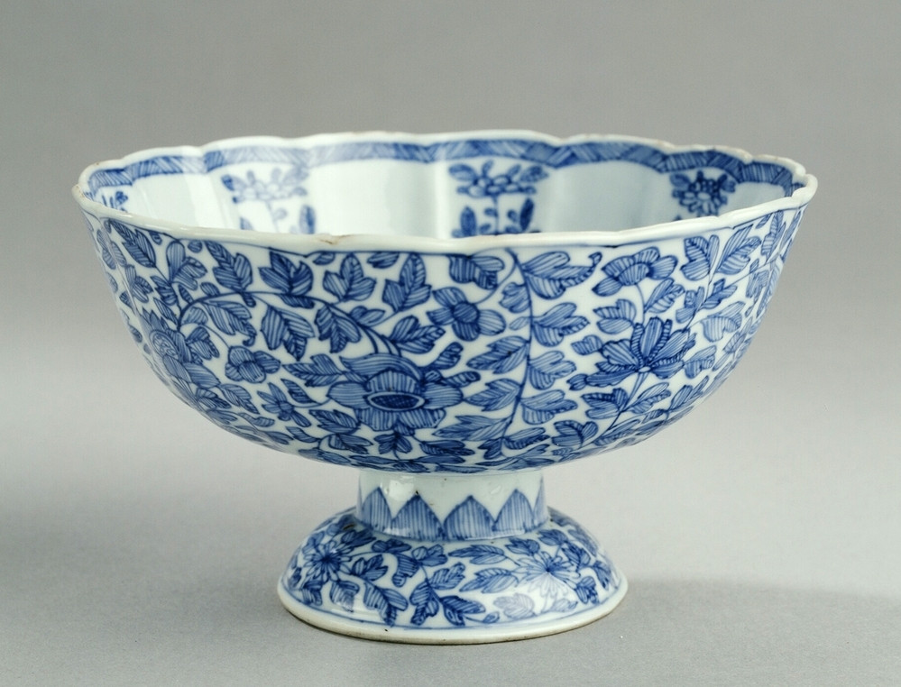Bell-shaped cup with woman and man in a landscape and scrolls
