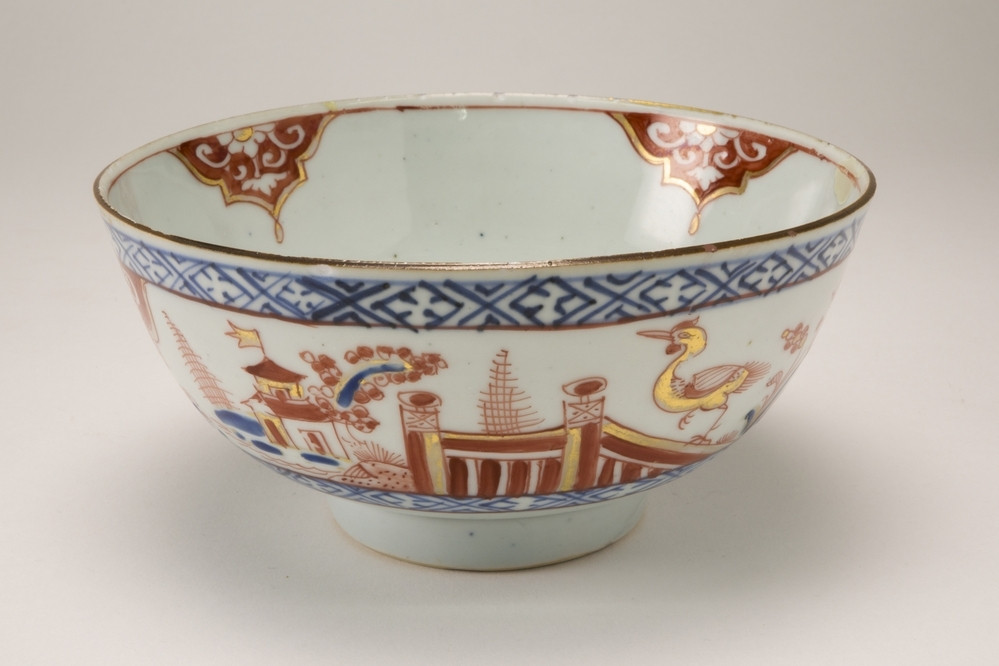Cup and saucer with 'egg and spinach' pattern and cock among plants