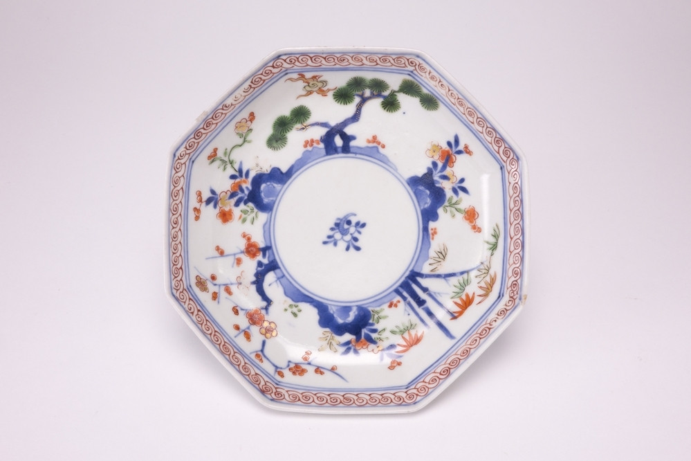 Rijksmuseum Amsterdam Bell-shaped cup and saucer with two figures in front of a pavilion and flower sprays