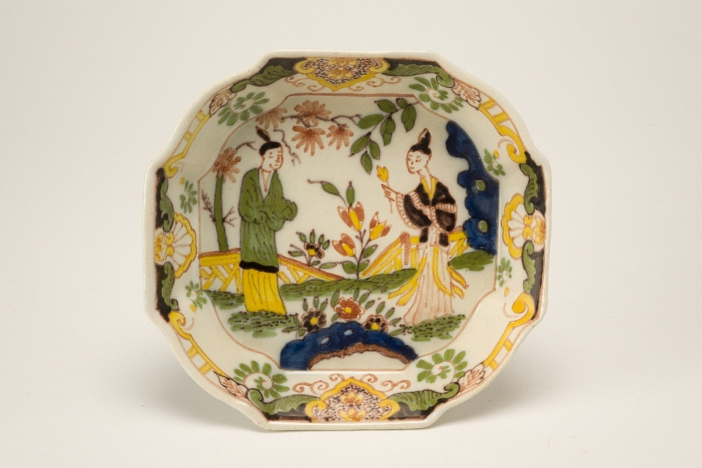 Keramiekmuseum Princessehof Schotel met decor van bloempot op terras omgeven door vakken waarin de Drie Vrienden