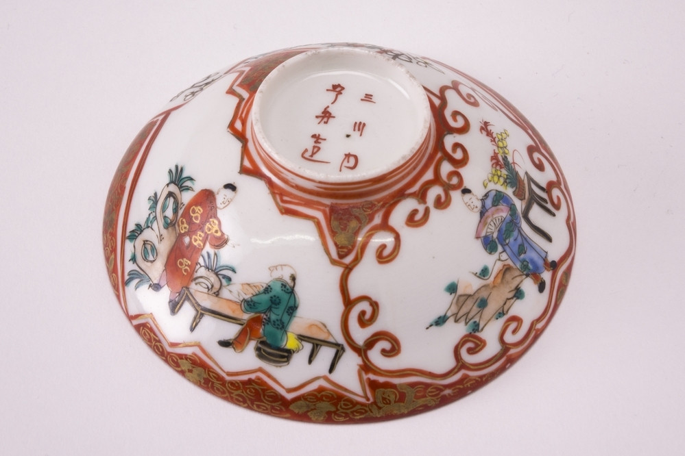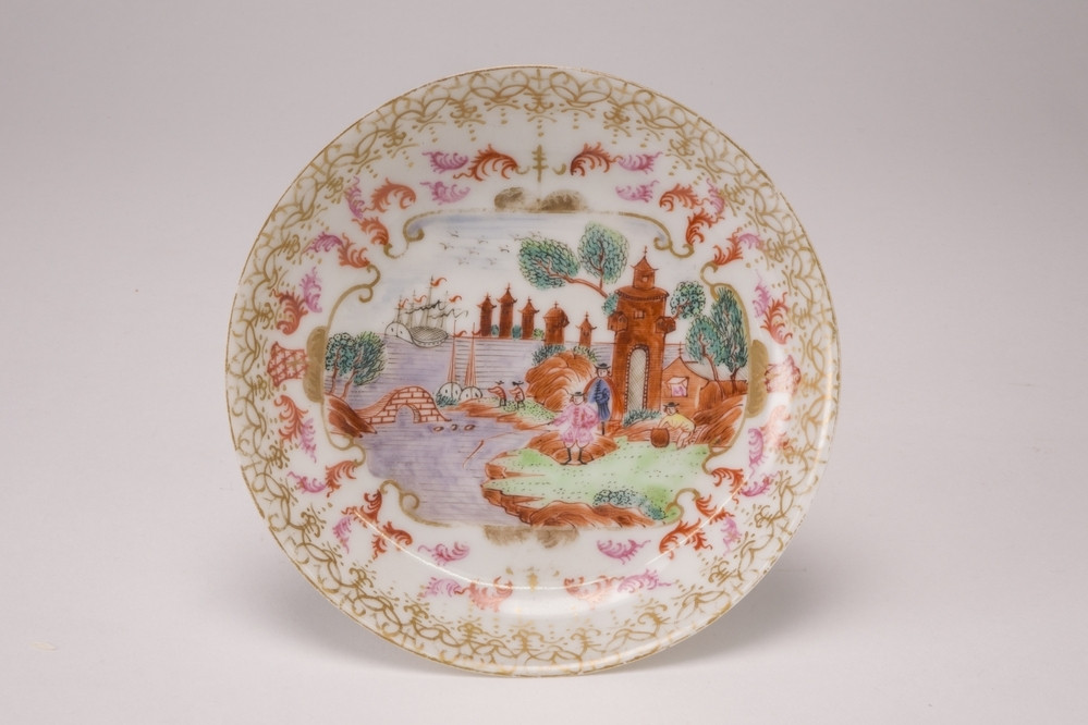 Keramiekmuseum Princessehof Kop met oor en decor van vrouwenfiguur en kind aan de waterkant, famille rose