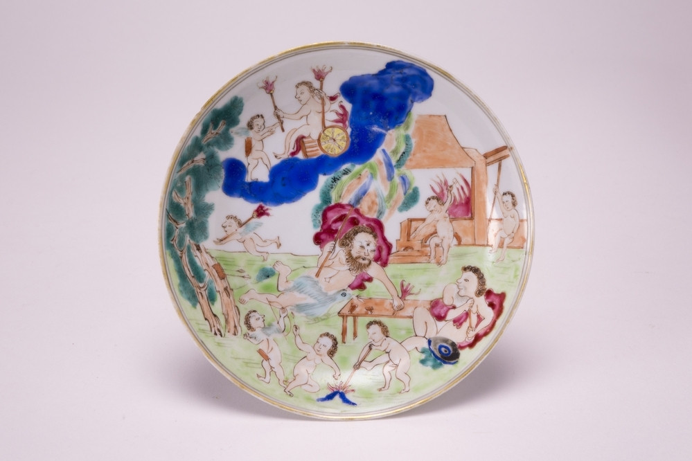 Rijksmuseum Amsterdam Klokvormige kop en schotel met vlinders, bloemranken en gelukssymbolen in cartouches