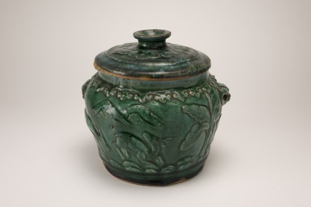 Keramiekmuseum Princessehof Pot met deksel en decor van tuinlandschap met figuren in 2 uitgespaarde vakken omgeven door gebroken ijs patroon.