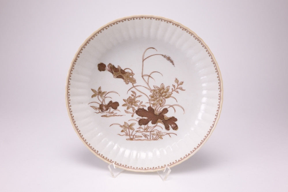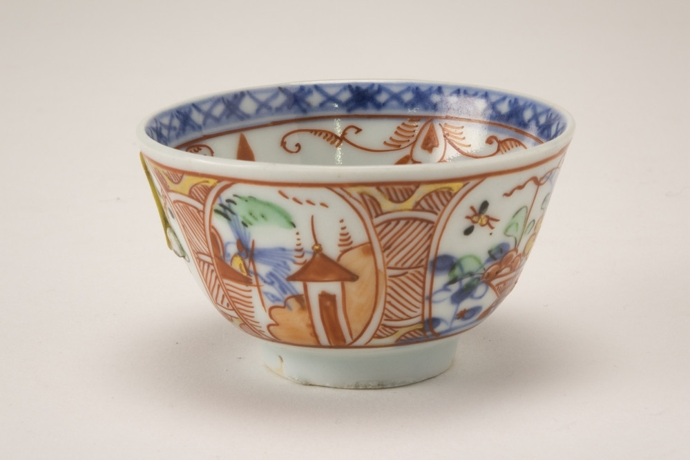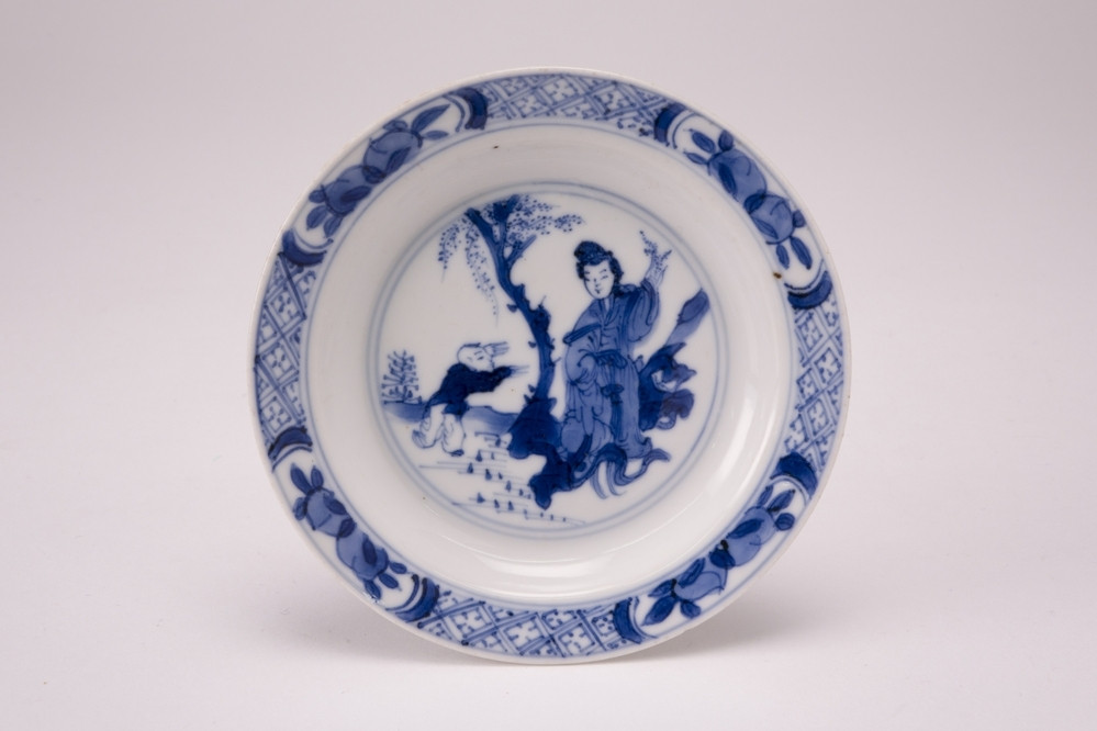 Deksel van theepot met ronde knop en decor van vakjes en strepen
