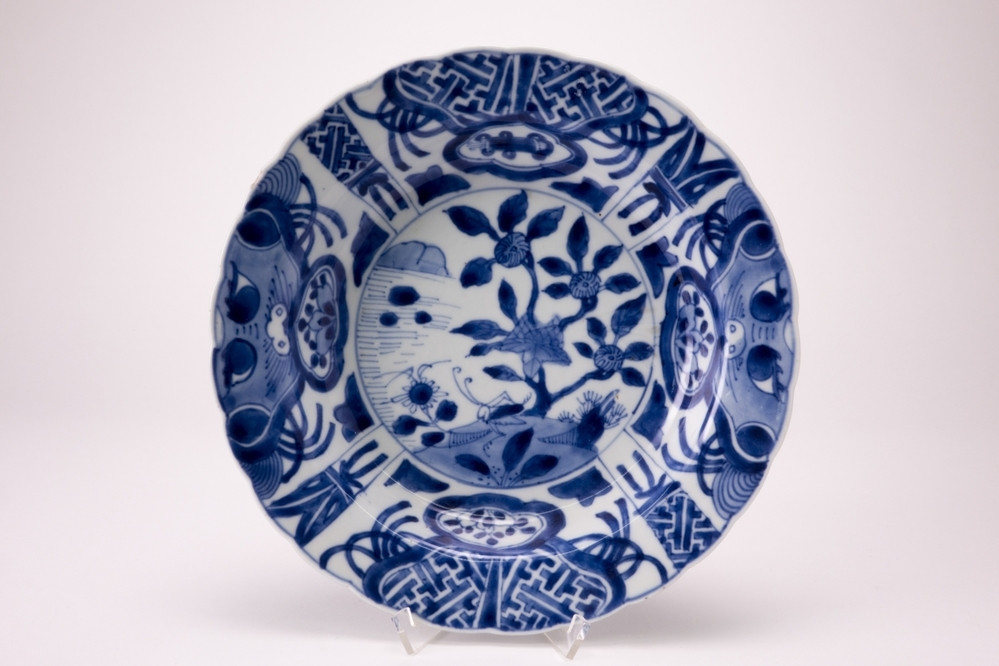 Keramiekmuseum Princessehof Schoteltje zonder kop met decor van bladvormige en rolvormige vakken, waarin bloemen