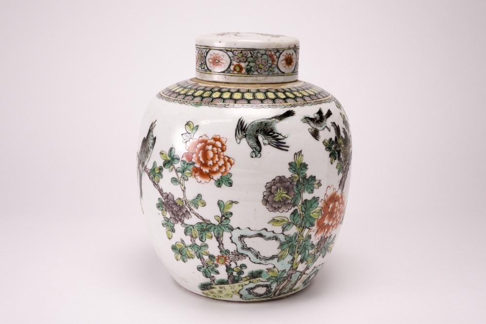 Keramiekmuseum Princessehof Botervloot met deksel met decor van bloeiende ranken, hekwerk en rotspartijen, imari
