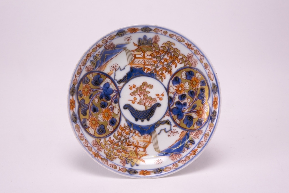 Keramiekmuseum Princessehof Schoteltje met polychroom decor van vakken waarin bloemen tegen een verguld fond