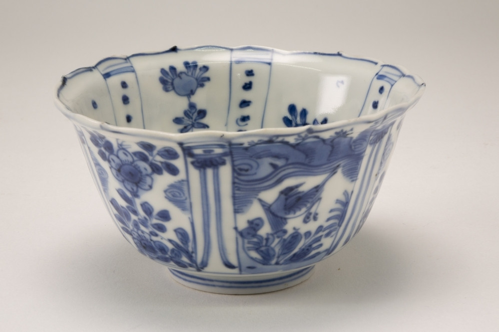 Keramiekmuseum Princessehof Kop en schotel met geschulpte rand met decor van feniks en diverse andere vogels in rotslandschap