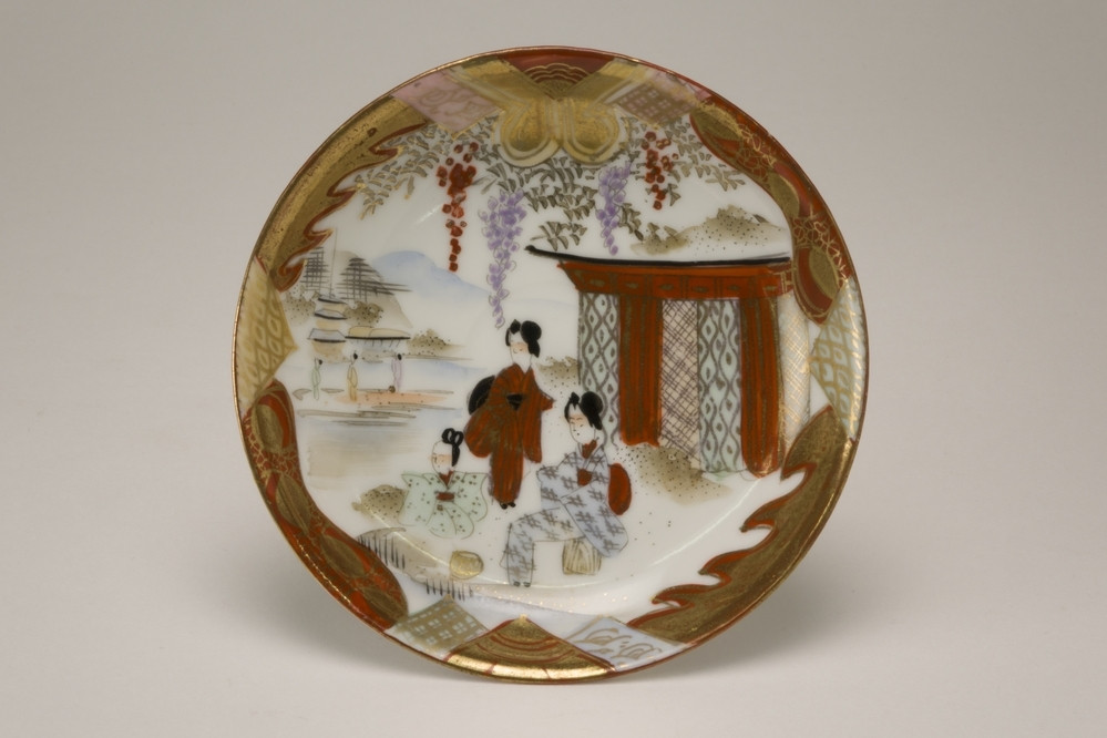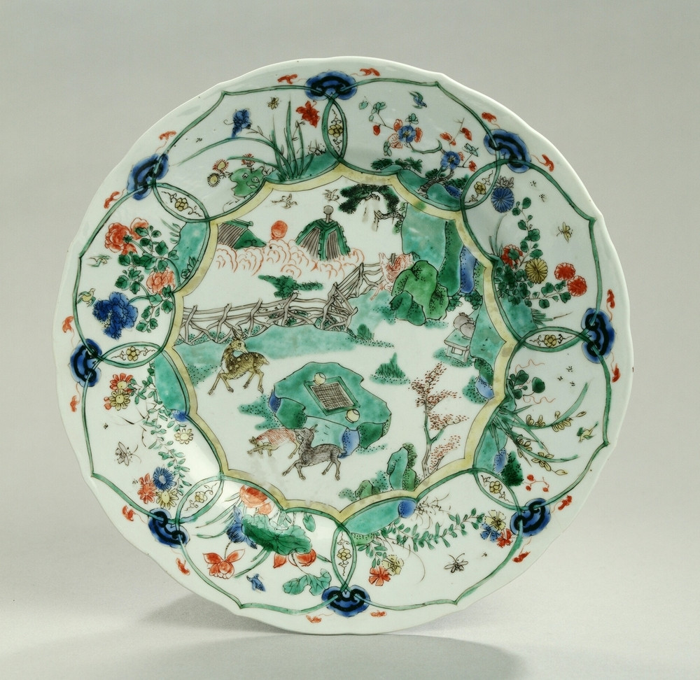 Keramiekmuseum Princessehof Schaal met decor van stervormig paneel waarin een kraanvogel en rondom symbolen