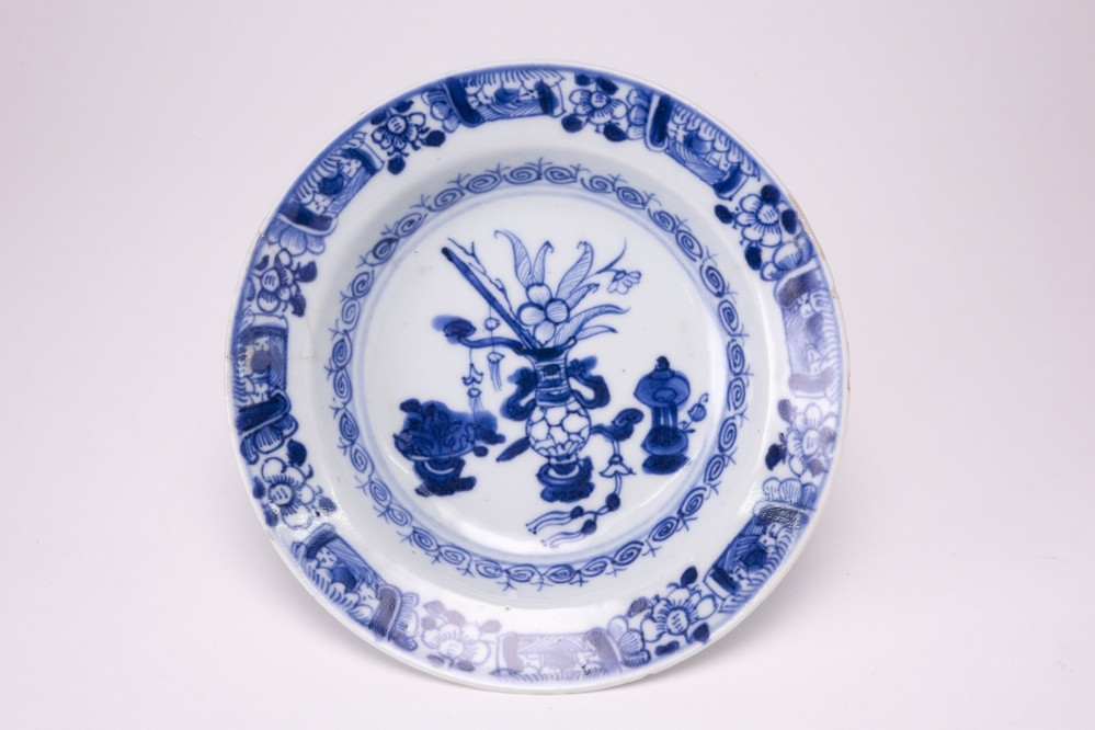 Keramiekmuseum Princessehof Kom met decor van 2 Europese mannen en 2 struiken, café au lait en onderglazuur blauw