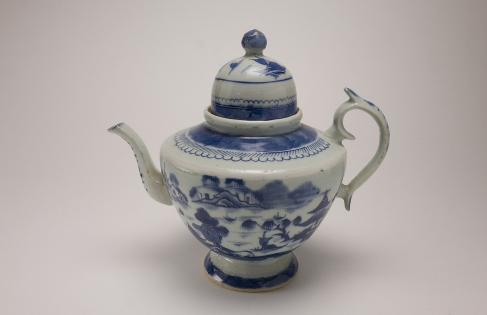 Keramiekmuseum Princessehof Kop met oor en met decor van meerlandschap en terras met figuren, mandarijnporselein