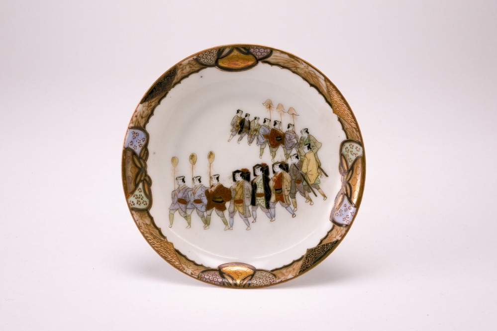 Keramiekmuseum Princessehof Schotel, onderdeel van een kop en schotel met gouddecor van arabesken op zwarte ondergrond