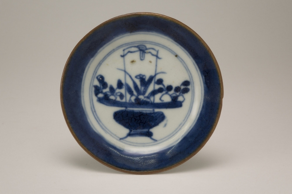 Blauw porseleinen bord, versierd met V.O.C.-monogram