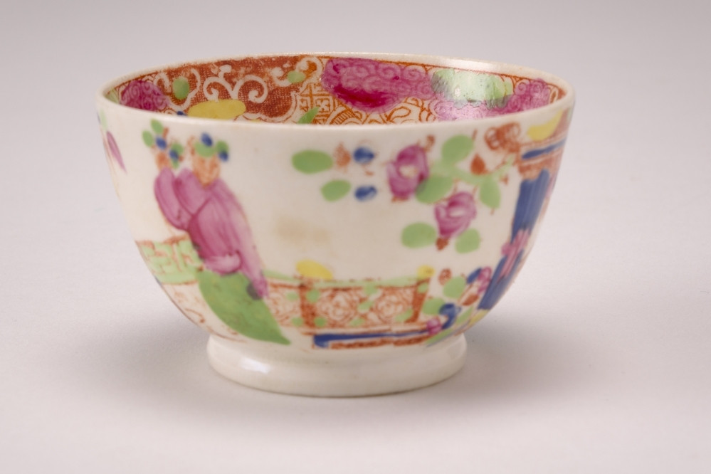Kop en schotel met 'egg and spinach' patroon en haan tussen planten