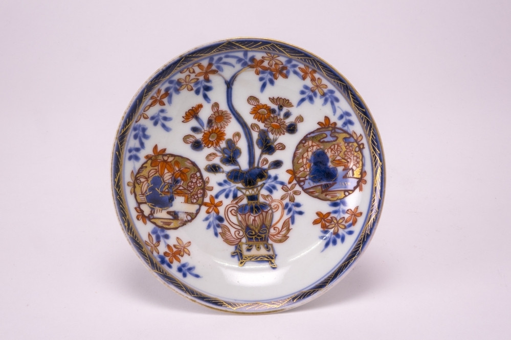 Keramiekmuseum Princessehof Kop en bord met polychroom kakiemon decor van kersenbloemsems en bijbehorend doosje