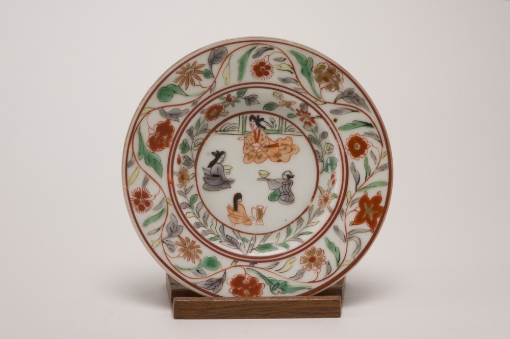 Imarischoteltje met brede rand op standring. Op de binnenzijde is op de rand een slingerende bloemdecoratie aangebracht. Op het plat in ijzerrode cirkels met rondom bloemdecoraties vier zittende personen. De decoraties zijn gemaakt in ijzerrood, groen, paars en goudkleur.