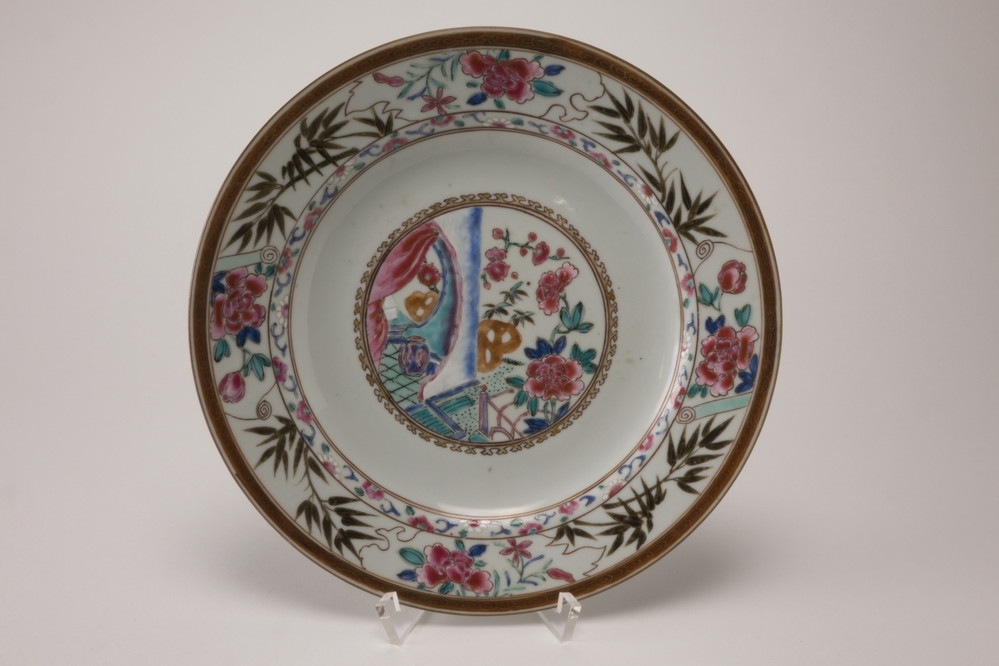 Bord Meer informatie Collectie Jan Menze van Diepen Stichting Beschrijving Famille rose bord met langs de lip een bruine rand. Op de rand omen om pioenrozen en bamboetakken. Op het plat in een cirkel een hoek van een huis met gordijn en buiten een hekwerk en pioenrozen. Details Materiaal/techniek gebakken keramiek Inventarisnummer JMD-P-0779 Objectsoort bord Deel dit voorwerp Deel dit object op Facebook Deel dit object op Twitter Deel dit object op Instagram Deel dit object op Pinterest Deel dit object op WhatsApp