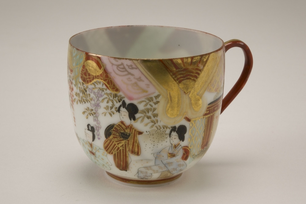 Dunwandig Satsuma kopje met een landschapdecoratie in ijzerrood, groen, blauw, goud en zwart.