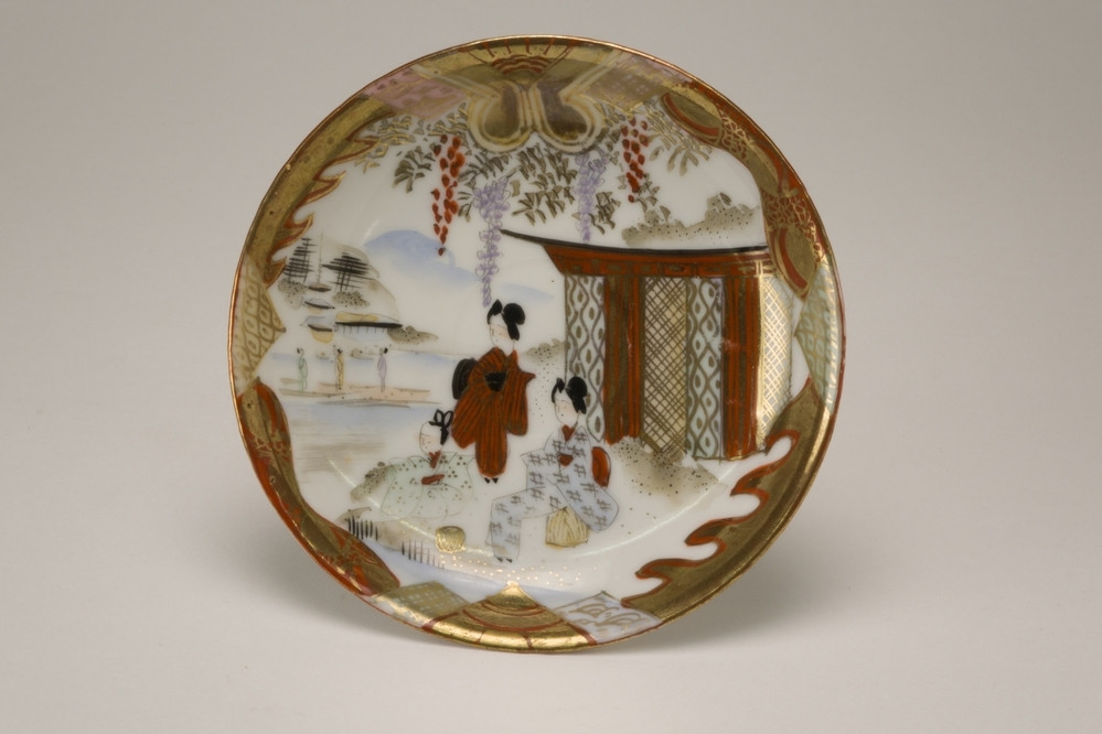 Dunwandig Satsuma schoteltje met een landschapdecoratie in ijzerrood, groen, blauw, goud en zwart.