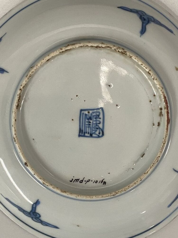 Schoteltje op voetring, spreidende rand. Versierd in onderglazuur blauw met een Chinees die op een kruk zit en een pipa bespeelt. Boven hem een maantje. Op de achterzijde vier wolkmotieven. Onder op de bodem een rechthoekig merk. Ko-sometsuke voor de Japanse markt (zie cat. 33). Een van de vaardigheden die een intellectueel in China geacht werd te beheersen was het bespelen van luit-achtige snaarinstrumenten zoals de pipa (hier afgebeeld) en de qin (zie cat. 38}). Andere gepaste bezigheden waren het schrijven van poezie, de beoefening van calligrafie en schilderkunst en het spelen van schaak (weiqi). Een polychrome variant bevindt zich in de Kempe collectie, Ulricehamn. Zweden (Gyllensvard).