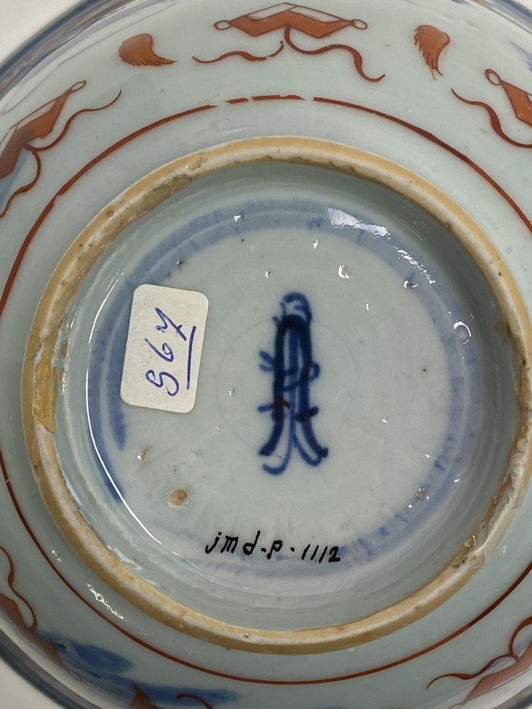 Amsterdams bont kom van porselein op standring gedecoreerd met in onderglazuur blauwe zotjes. Hierover gedecoreerd in ijzerrood met gestyleerde bloemen en lampionnen .
