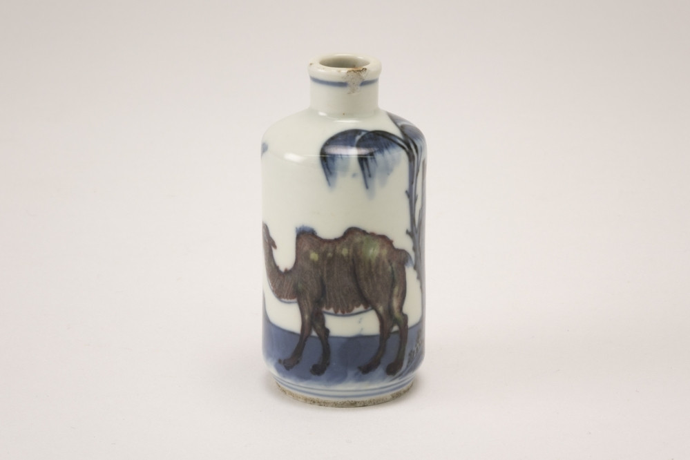 Porcelain, cylindical form, decorated in underglaze blue and (misfired) underglazed red with a rudimantary figure leading a camel to some gates which have a name above, the base inscribed daqing Qianlong nianzhi (made during the reign of the emperor Qianlong). Chinese, Jingdezhen, 19th century (chipped neck).