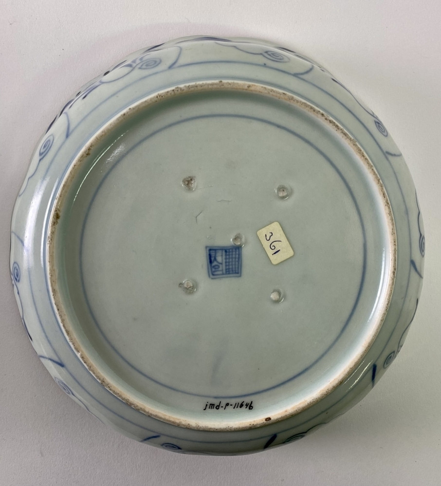 Blauw witte schaal met gelobte golvende rand met op de lip een bruine lijn.Op de binnen- en buitenzijde blauwe bloemdecoraties.