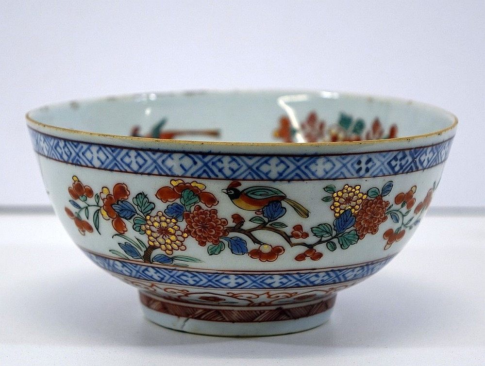 Bowl on footring, spreading sides. Decorated in China with underglaze blue with a diamond-work band around the rim and foot, otherwise plain. Overdecorated in Holland with with two groups comprising a bird and a flower spray. On the inside of the sides four flower sprays, flying birds between. The decoration was inspired by Japanese Kakiemon porcelain, which often has a bird on a flower spray and phoenixes in flight as prominent motifs. Here, the motifs have been simplified, enlarged, and used as independent decorative elements. As the bowl, cat. 111, the original Chinese rim decoration has has been respected.
