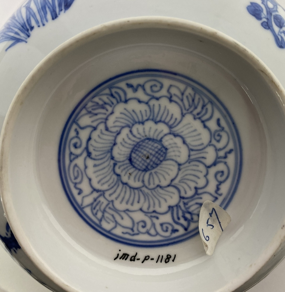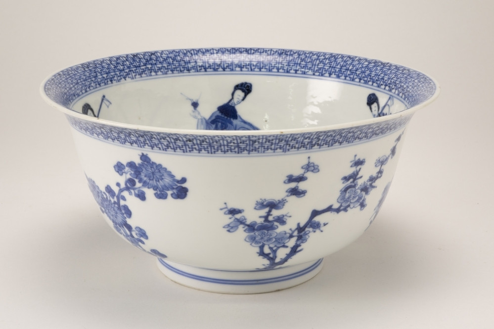 Grote blauw witte klapmuts met aan de binnenzijde vijf lijzen. Op het plat acht symbolen. Langs de rand aan de binnen- en buitenzijde een blauwe sierrand. Aan de buitenzijde vijf verschillende bloemdecoraties.