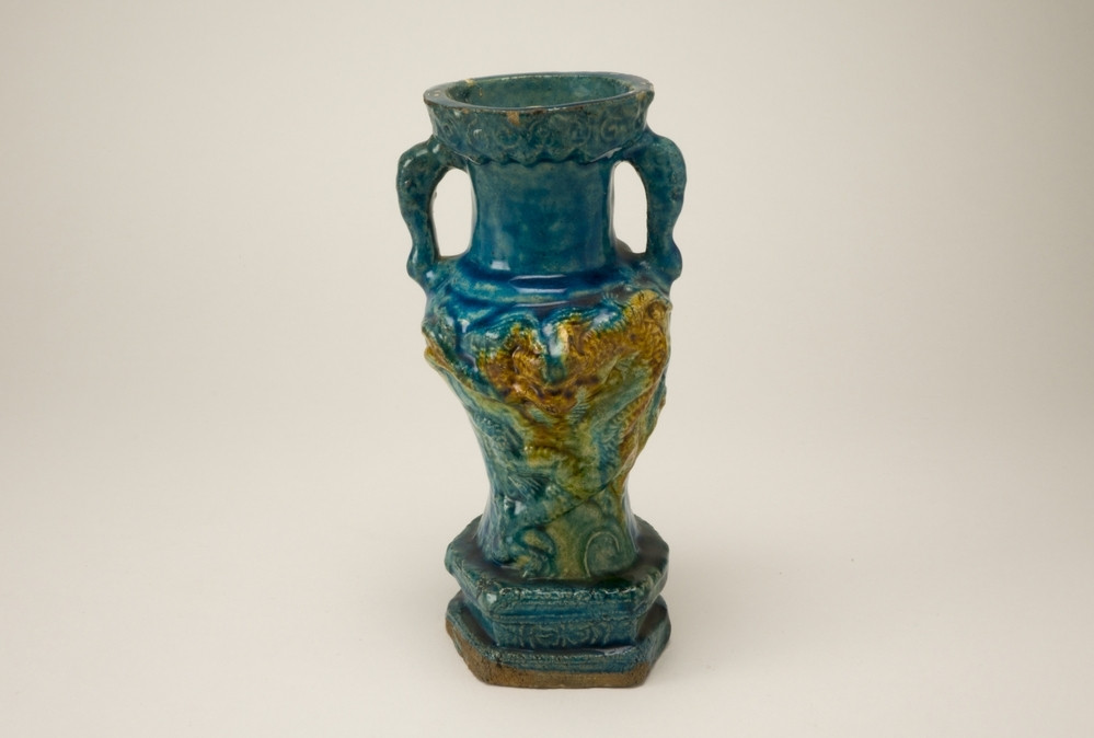Hoge blauwe vaas met zes hoekige voet. Op de voor- en achterzijde in reliëf een bruine draak.