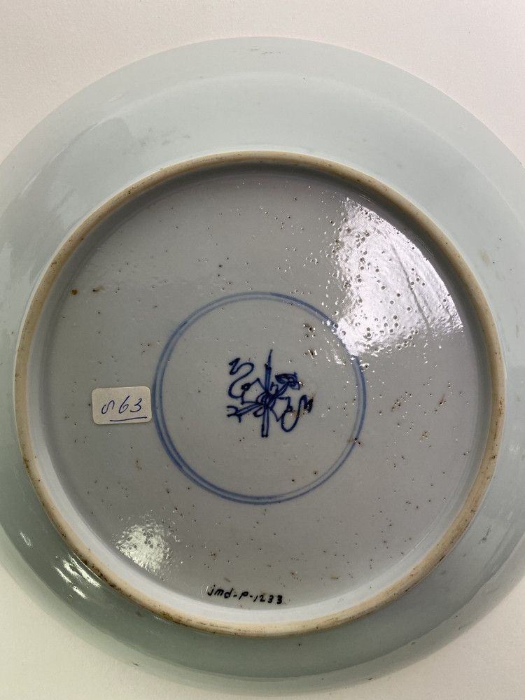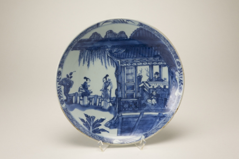 Blauw wit bord met op het plat een decoratie van een huis met tuin met daarin vier Chinese personen.