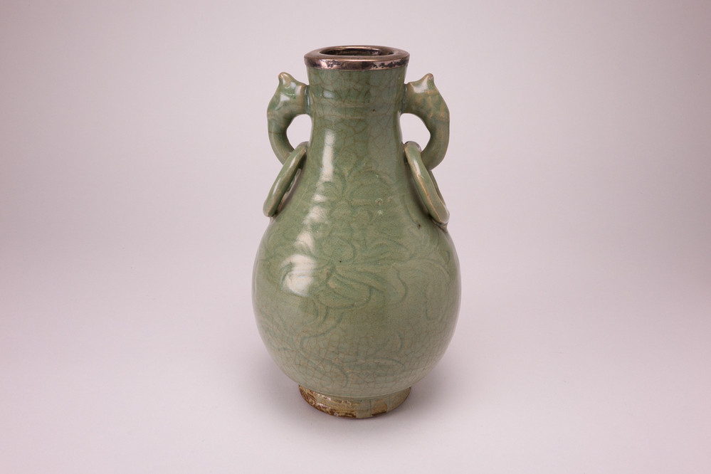 Celadon vaas met reliëfdecoraties onder een groene glazuurlaag. De oren zijn in de vorm van olifantskoppen met ring vastgehouden door de slurf. Op de bovenrand een koperen ring. Ming.
