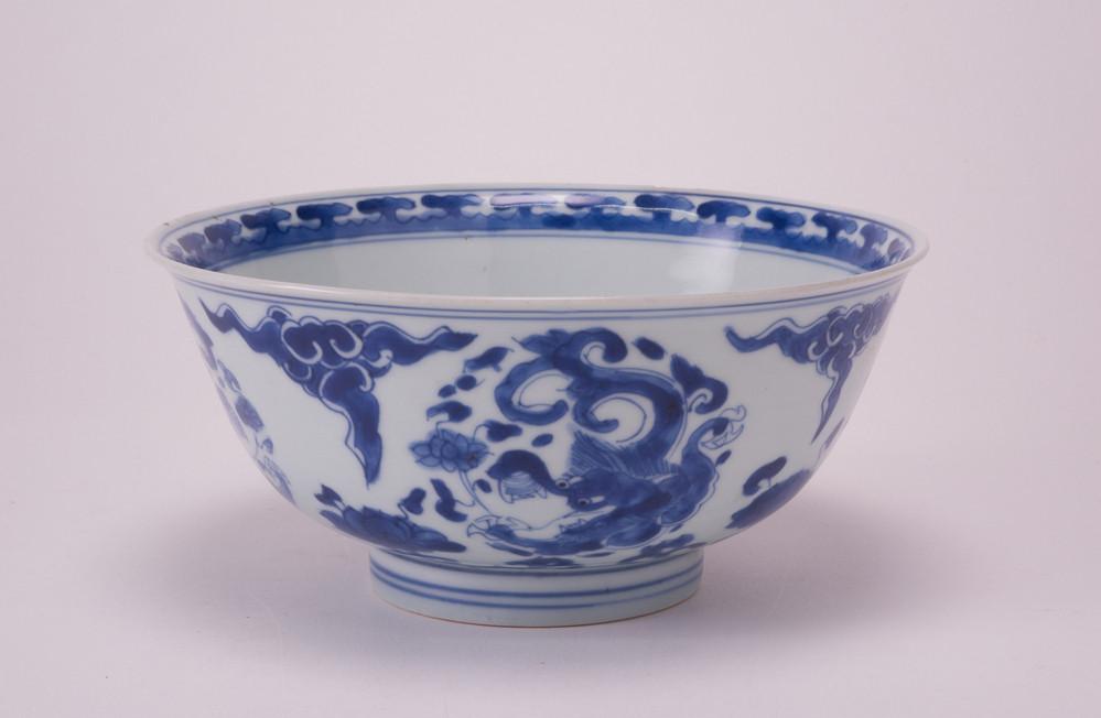 Grijswitte kom op standring met naar buiten gebogen lip. op de binnen- en buitenzijde blauwe bloem- en drakendecors.
