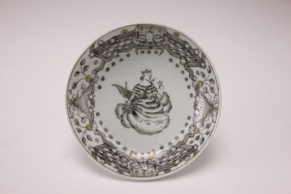 Een Chine de Commande porseleinen wit schoteltje met op het plat een in 'Encre de Chine' aangebrachte Europese voorstelling van de godin Juno (Hera), de godin van het huwelijk. Kop en schotel op voetringen, licht afgeknotte randen. Gedecoreerd in encre de Chine en goud met een centraal tafereel van een gekroonde figuur zittend op een wolk naast een pauw, die een scepter en krans vasthoudt. Op de rand een rand van pauwen en panelen omzoomd met bandwerk, bloemenfestoenen en foliate-scrolls naar een vroeg 18e eeuws laub- und bandelwerk Weens ontwerp; het theekopje is op dezelfde manier versierd met hetzelfde tafereel op de bodem. De Griekse godin Hera, de Koningin van de Hemel genoemd, was een machtige koningin in haar eigen recht, lang voor haar huwelijk met Zeus, de machtige koning van de Olympische goden. De godin Hera heerste over de hemelen en de aarde, verantwoordelijk voor elk aspect van het bestaan, inclusief de seizoenen en het weer. Zij werd ook vereerd als de Romeinse godin Juno, echtgenote van Jupiter; de maand juni is naar haar vernoemd. Het is mede op grond van Hera's grote schoonheid, en vooral haar mooie. grote ogen, dat zij in verband wordt gebracht met de pauw m...