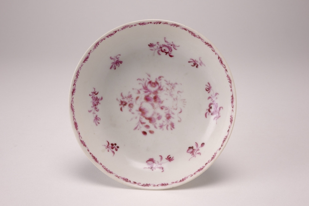 Witte gladde schotel met op het plat lila bloemdecoraties. Langs de binnenrand een smalle lila bladranken band.