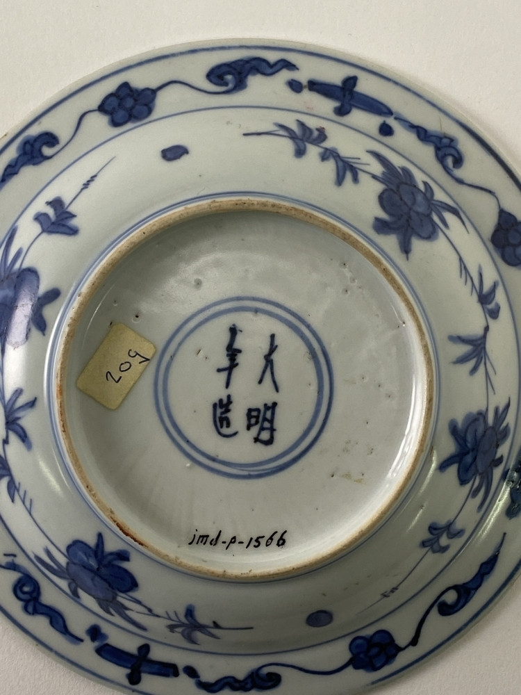 Schotel op voetring, brede platte rand. Versierd in onderglazuur blauw met twee vliegende kraanvogels en wolkmotieven. De zijkant is onversierd, op de rand perziktakken en gelukssymbolen met linten. Op de achterkant van de rand vier bloemtakjes en vier gelukssymbolen; op de achterkant van de wand twee perziktakken. Onder op de bodem het vier-karakter merk Da Ming nian zao (gemaakt onder de grote Ming). De versiering is kenmerkend voor het export porselein uit de tweede helft van de regeringsperiode van Keizer Jiajing (1522-1566). Dit kleine formaat komt minder vaak voor dan vergelijkbare groterere exemplaren.